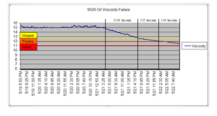 隨著原油粘度下降從正常到邊緣(約13 cP)在一段15小時40分鐘,工程師希望他能夠到達下維修設施。在接下來的8個小時,粘度中掉落的警告狀況(12 cP),對關鍵(11 cP)。它到達及時維修設施。調換火車頭,火車可能繼續(xù)其計劃。驗證了引擎故障,并進行了改革,具有顯著的節(jié)省公司。